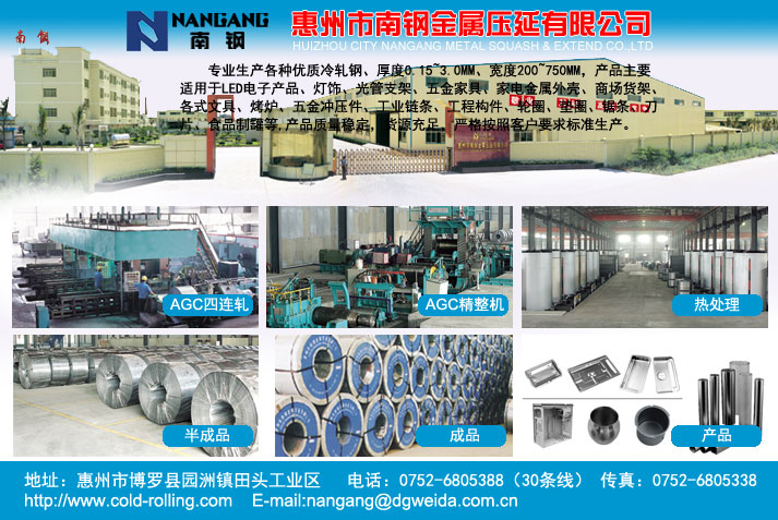 專業(yè)生產各種優(yōu)質冷軋鋼、厚度0.15~3.0MM、寬度200~750MM,產品主要適用于LED電子產品、燈飾、光管支架、五金家具、家電金屬外殼、商場貨架、各式文具、烤爐、五金沖壓件、工業(yè)鏈條、工程構件、輪圈、墊圈、鋸條、刀片、食品制罐等,產品質量穩(wěn)定,貨源充足,嚴格按照客戶要求標準生產。